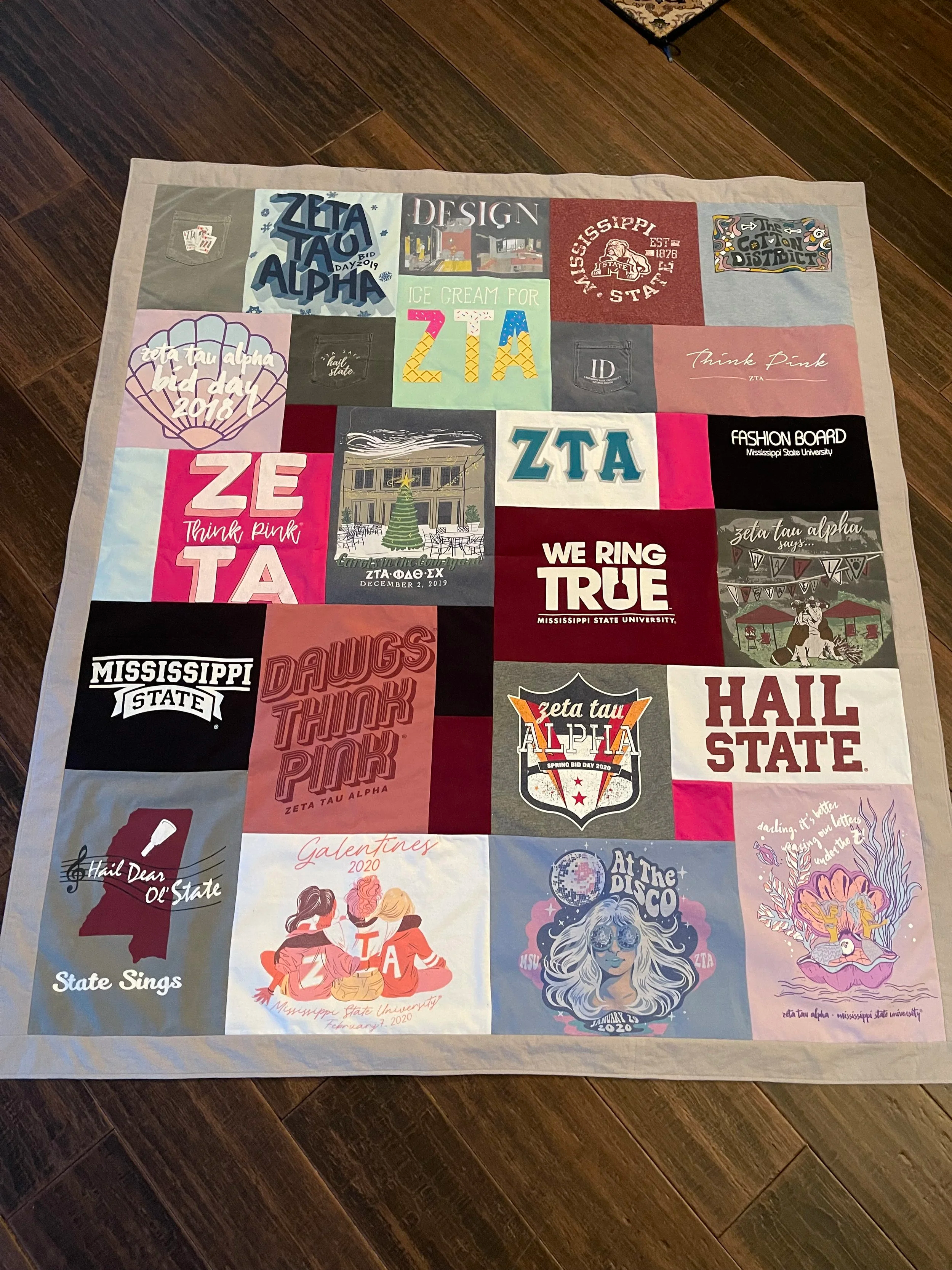 I offer a few different style options you can choose from…Block Style, Modified Block Style and Mosaic Style. However, sometimes the designs and decals on the shirts/clothing submitted will dictate what blanket style would look best.